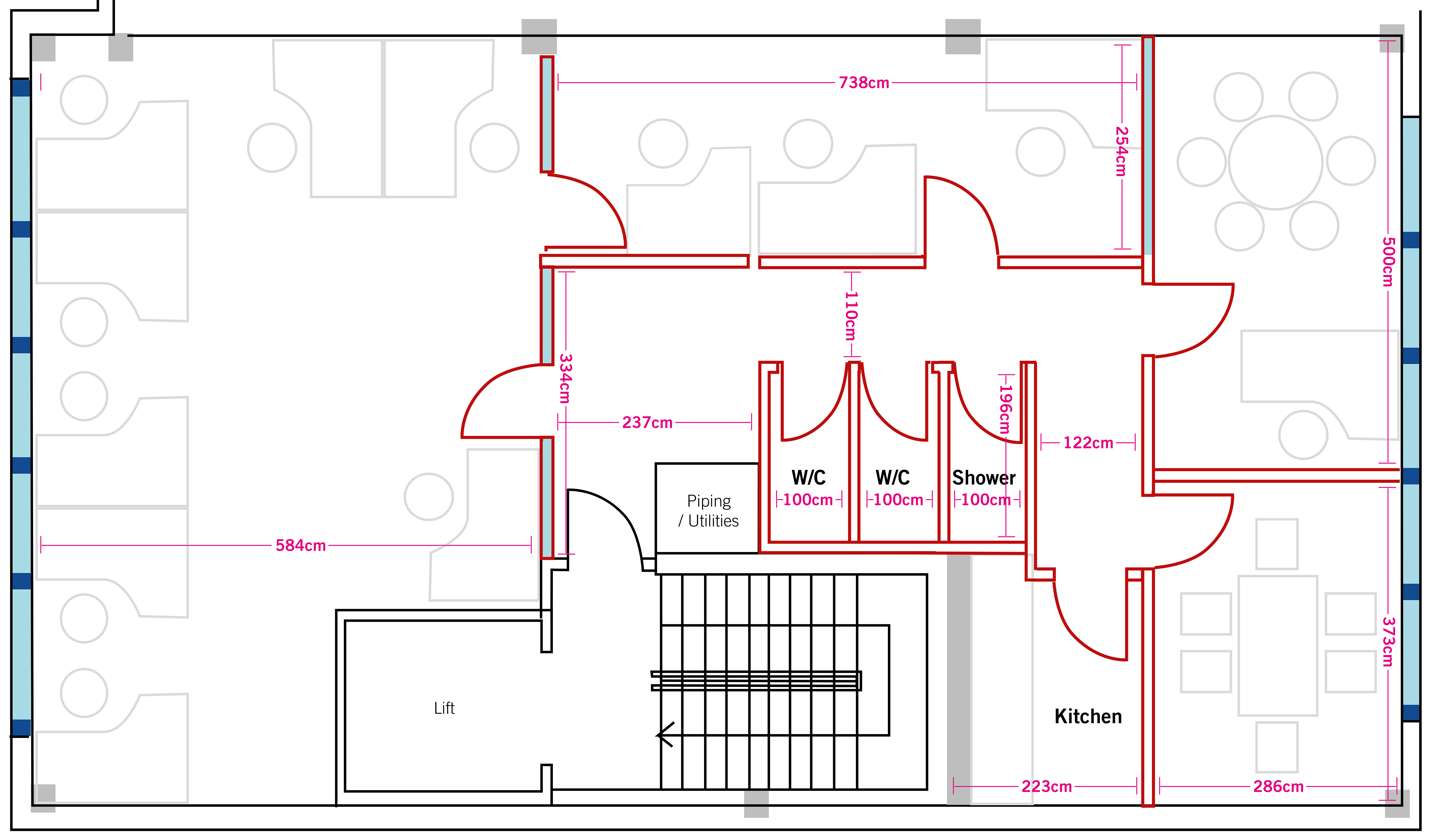 This suite is flexible and can be configured to suit your needs. It has previously been used as a design studio, a legal office, and a physical therapy clinic.